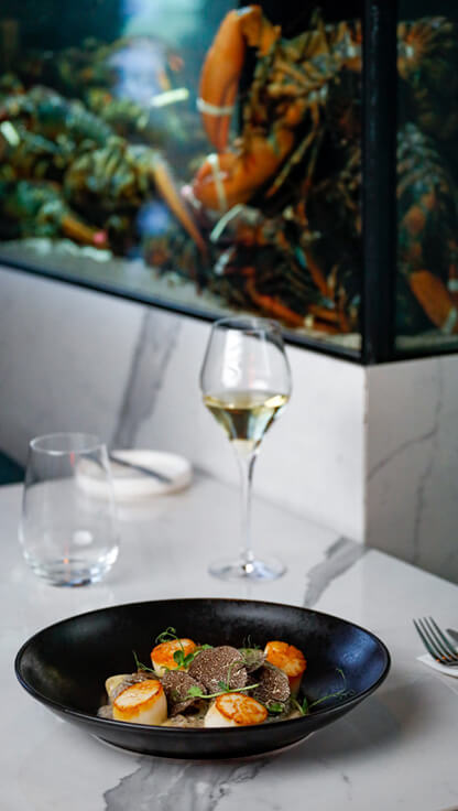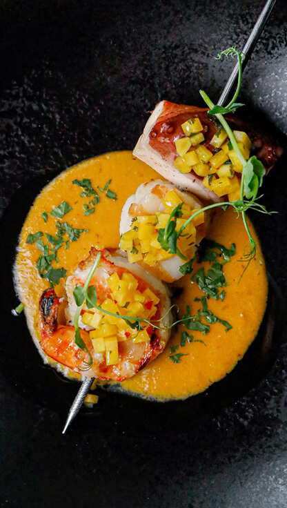 Nasze propozycje łączą klasykę i nowoczesność – owoce morza z grilla, krem z homara, pstrąg z czosnkiem niedźwiedzim, tuńczyk bluefin z grejpfrutem i ponzu, ceviche z małży z marakują, czy risotto z owocami morza i szafranem to tylko obiecująca część oferty.